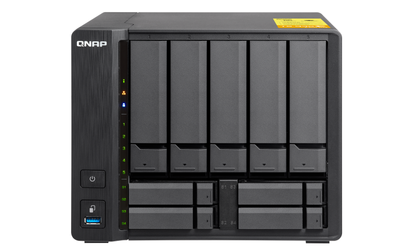 支持 9 颗硬盘的 TS-932X 具备 5 个 3.5 英寸硬盘插槽以及 4 个 2.5 英寸 SSD 专用埠,但体积却与一般 4-bay 至 6-bay NAS 的尺寸相当,在容量、效能与体积之间展现平衡点,适合中小型企业与个人工作室用户。要求沉稳、低调的外型设计,却隐约透露出令人惊喜的细节:LED 灯号显示设计舒适不剌眼,让外观更简洁;发丝纹路设计的控制面板,让低调的 TS-932X 增添质感;而直式搭配横式的硬盘机构排列,大幅减少 NAS 机身多余的尺寸,更显精炼。